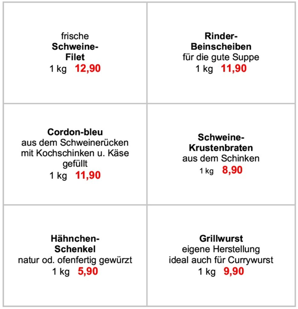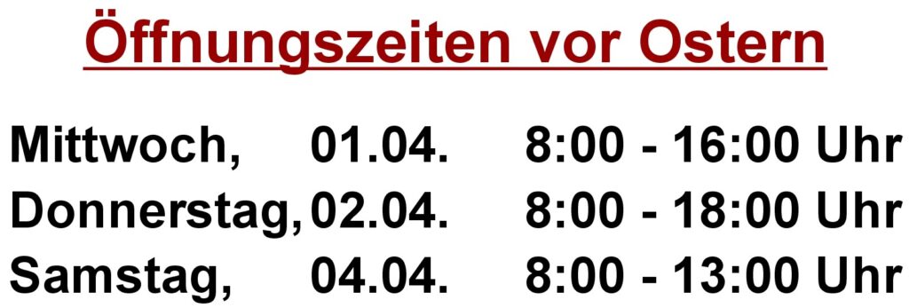 ++++++ ÖFFNUNGSZEITEN: Donnerstags von 8:00 bis 16:00 Uhr --- Freitags von 8:00 bis 18:00 Uhr --- Samstags von 8:00 bis 13:00 Uhr +++++
