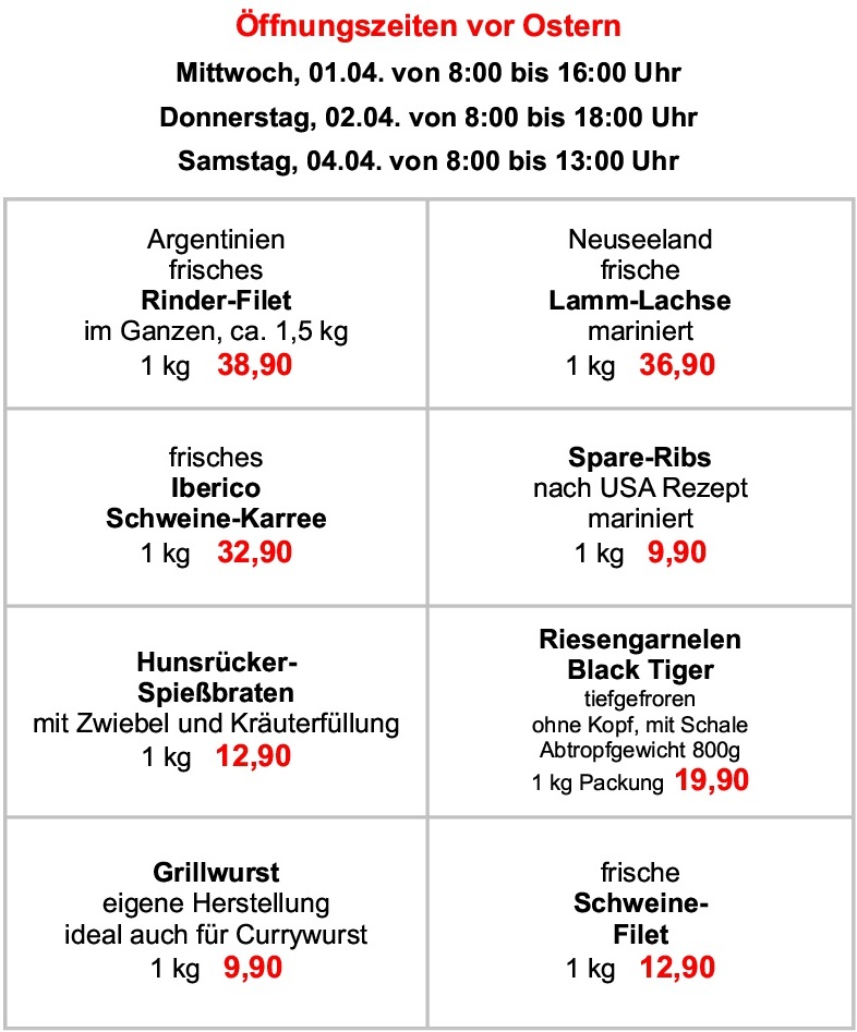 +++ Mittwoch, 01.04.2026 von 8:00 bis 16:00 Uhr geöffnet +++ Donnerstag, 02.04.2026 von 8:00 bis 18:00 Uhr geöffnet +++ Ostersamstag, 04.04.2026 von 8:00 bis 13:00 Uhr geöffnet +++